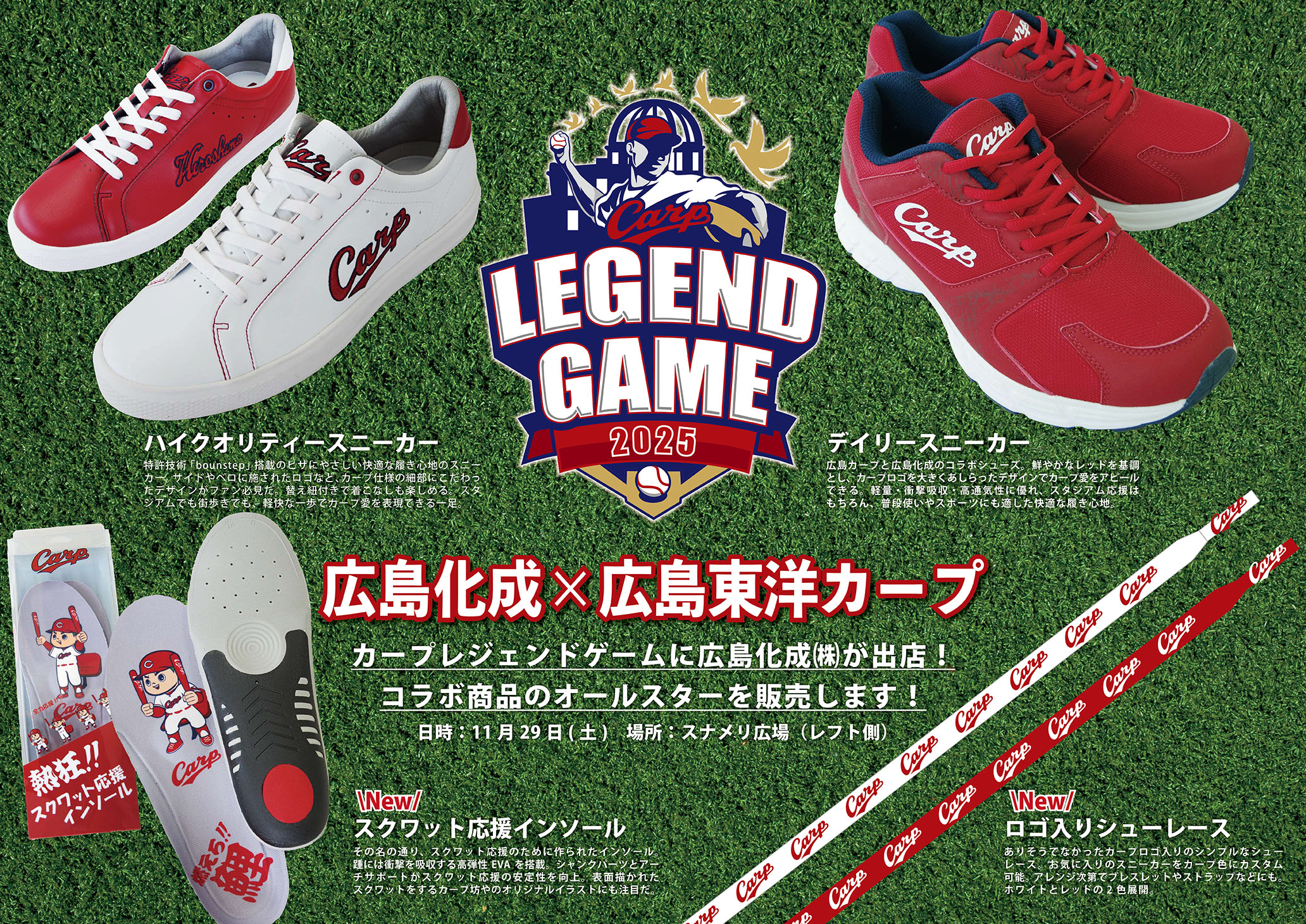 を搭載したスニーカーや、スクワット応援用のインソール、カープロゴ入り